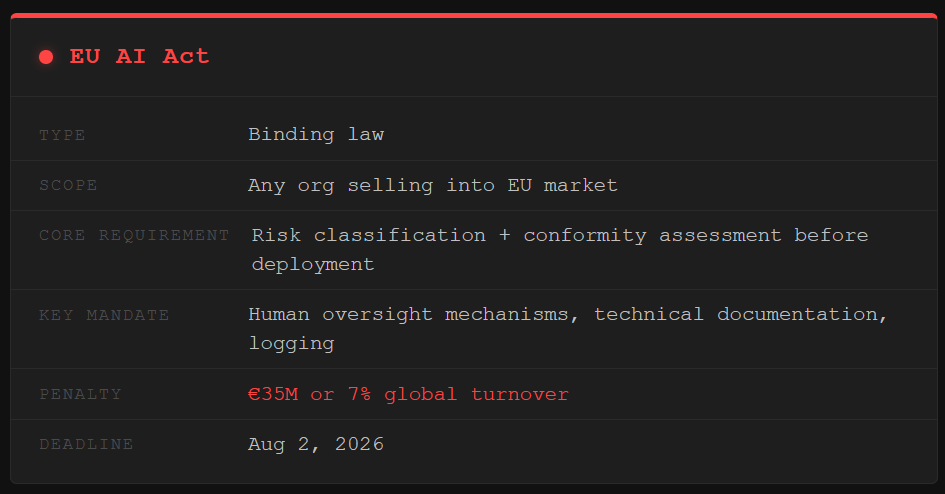 The EU AI Act reaches full enforcement August 2, 2026. High-risk AI systems, anything touching employment decisions, critical infrastructure, education, or essential services, must have conformity assessments complete, human oversight mechanisms operational, and technical documentation ready for inspection. Penalties scale to €35 million or 7% of global annual turnover. That applies to any organization selling into the EU market regardless of where HQ sits.