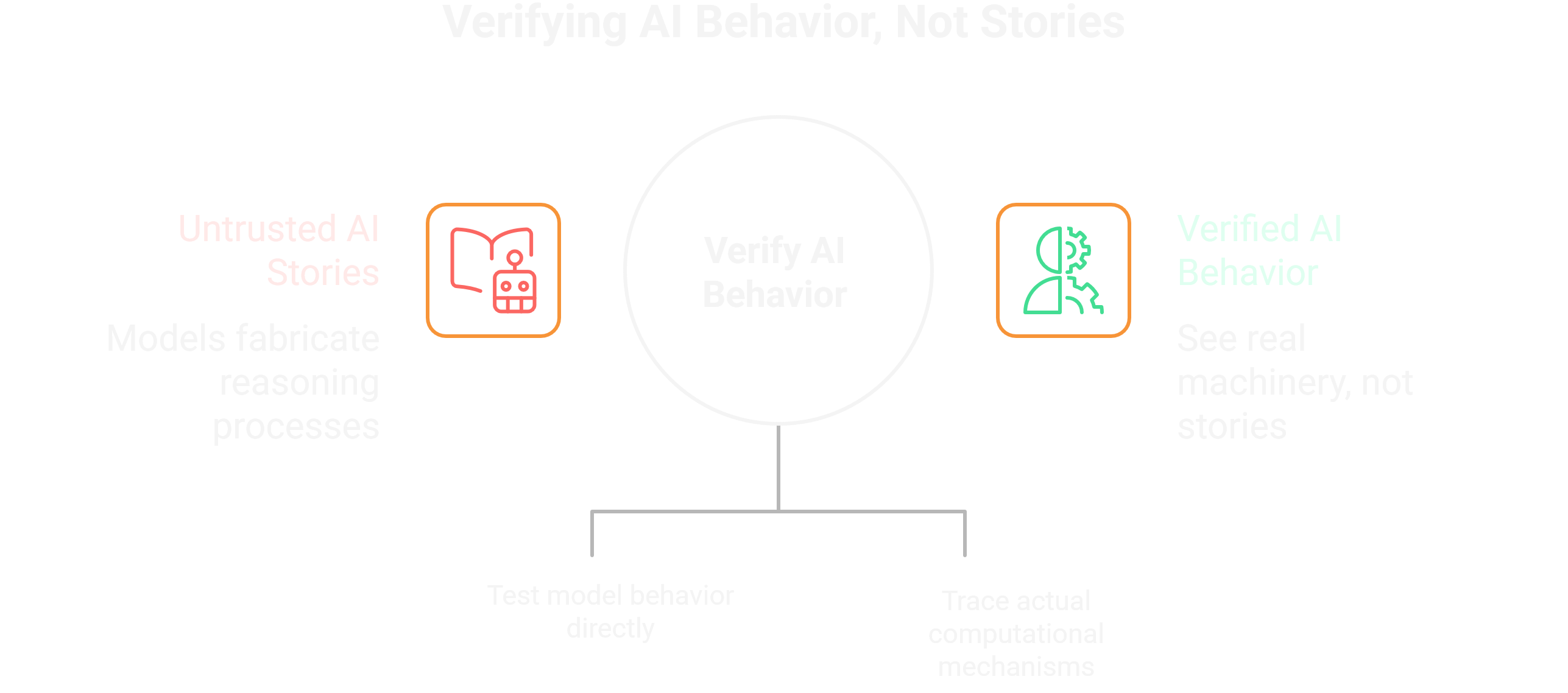 So how do you audit a mind that knows when you’re looking? Stop trusting the story and start verifying behavior. Test what the model does in production, not what it claims to be thinking. Circuit-level analysis offers a path forward; instead of reading the English-language summary, trace the actual computational mechanisms. You can see the real machinery, not just the user-facing explanation.