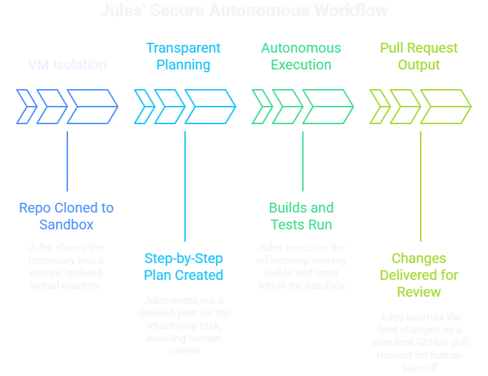 From there, the agent’s workflow moves through a transparent, four-stage process designed for security. It begins with VM Isolation, where the repo is cloned into a secure sandbox. Next comes Transparent Planning, where Jules maps out a step-by-step plan for human review and approval before it touches any code. Once approved, the agent moves to Autonomous Execution, running builds and tests within its isolated environment. The cycle concludes with the Pull Request Output, where the final changes are delivered as a standard GitHub PR, awaiting a final human sign-off. With this workflow, the security perimeter is no longer just the developer’s laptop; it’s the agent’s entire, self-contained execution environment.