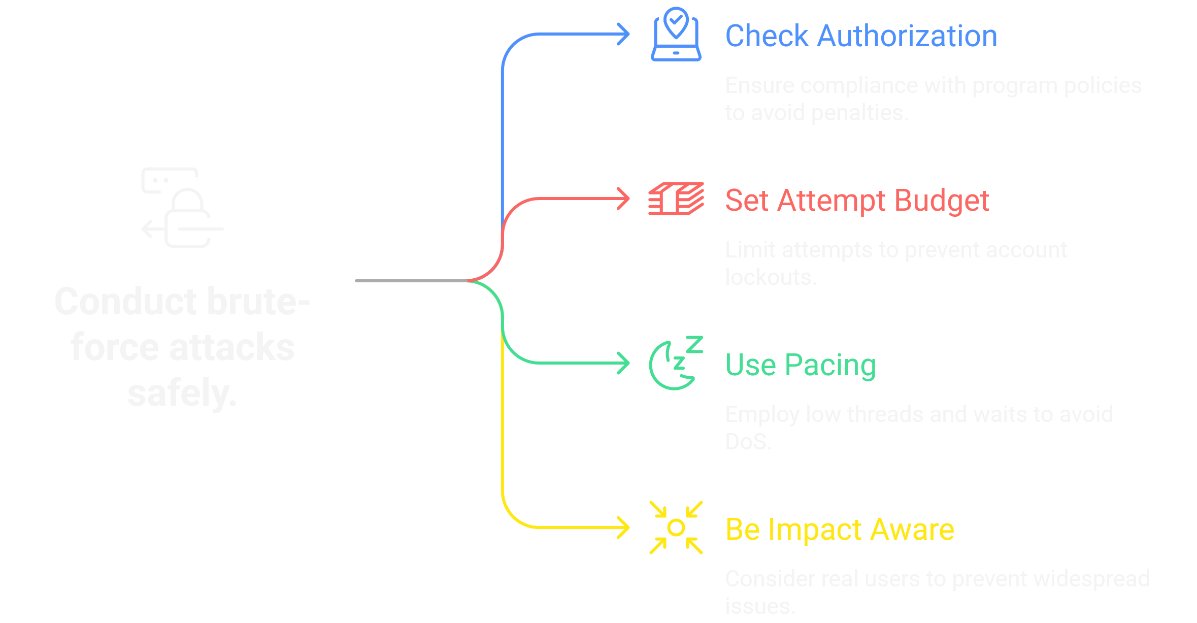 Before attempting a single password guess, it’s essential to set guardrails. First, recheck the program’s authorization and scope—many bug bounty platforms ban brute forcing outright or limit the number of attempts you can make. Next, establish an attempt budget by setting a strict cap, such as no more than ten tries per account or IP, and commit to sticking with it.
