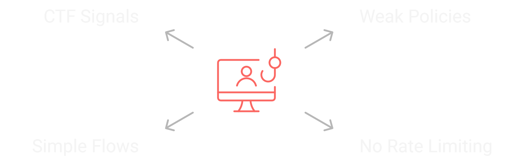 No/weak rate limiting: unlimited attempts, no backoff, or lockouts easy to evade.