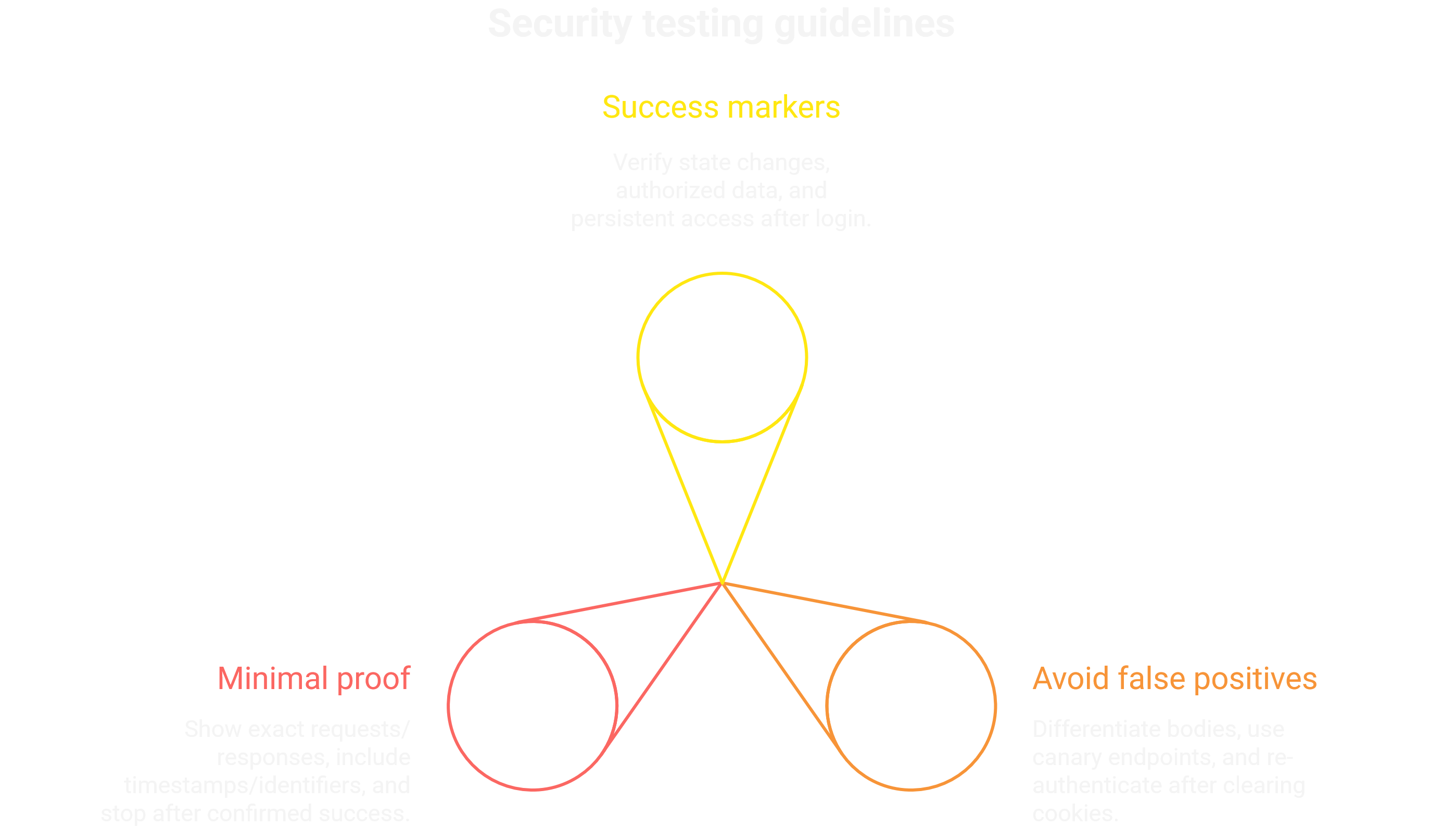Maintain minimal proof discipline by showing the exact request and response while redacting sensitive details. Include clear timestamps and unique identifiers, and stop testing once the first confirmed success is captured to prevent unnecessary exposure.
