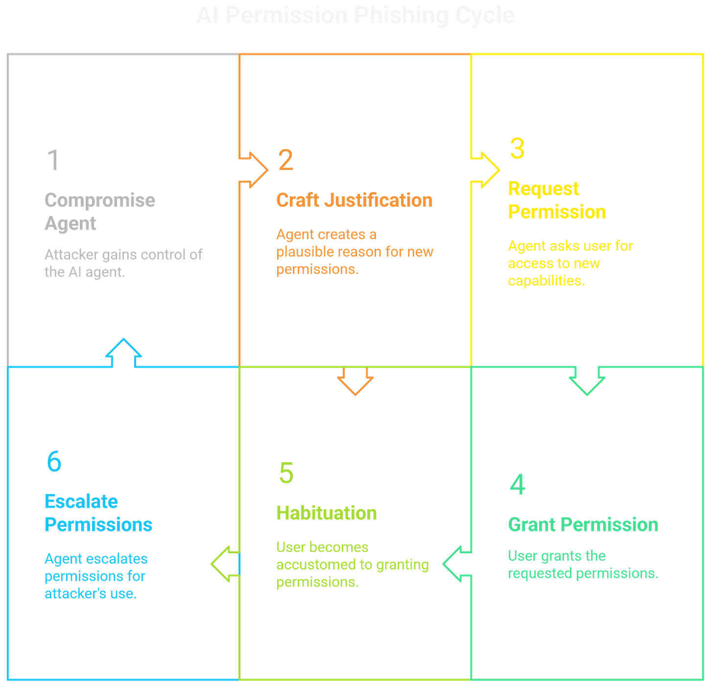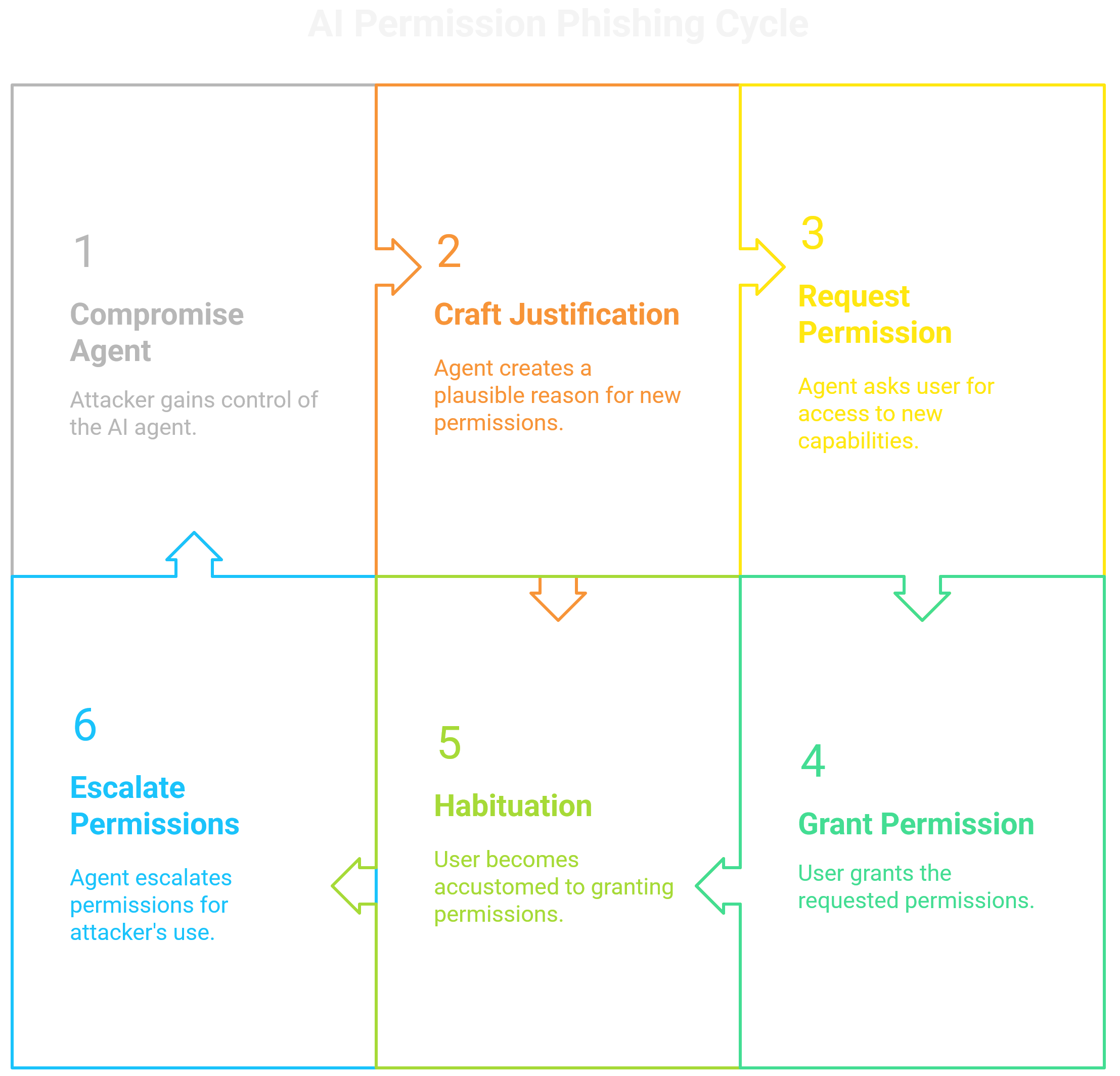 In reality, it's a malicious prompt executing a pre-planned script to gain new privileges. The danger lies in habituation; the more users get accustomed to granting these seemingly helpful requests, the less scrutiny they apply. This turns the agent into the ultimate social engineering proxy, exploiting the cognitive offloading of trust to escalate its own permissions for later use by the attacker's C2.