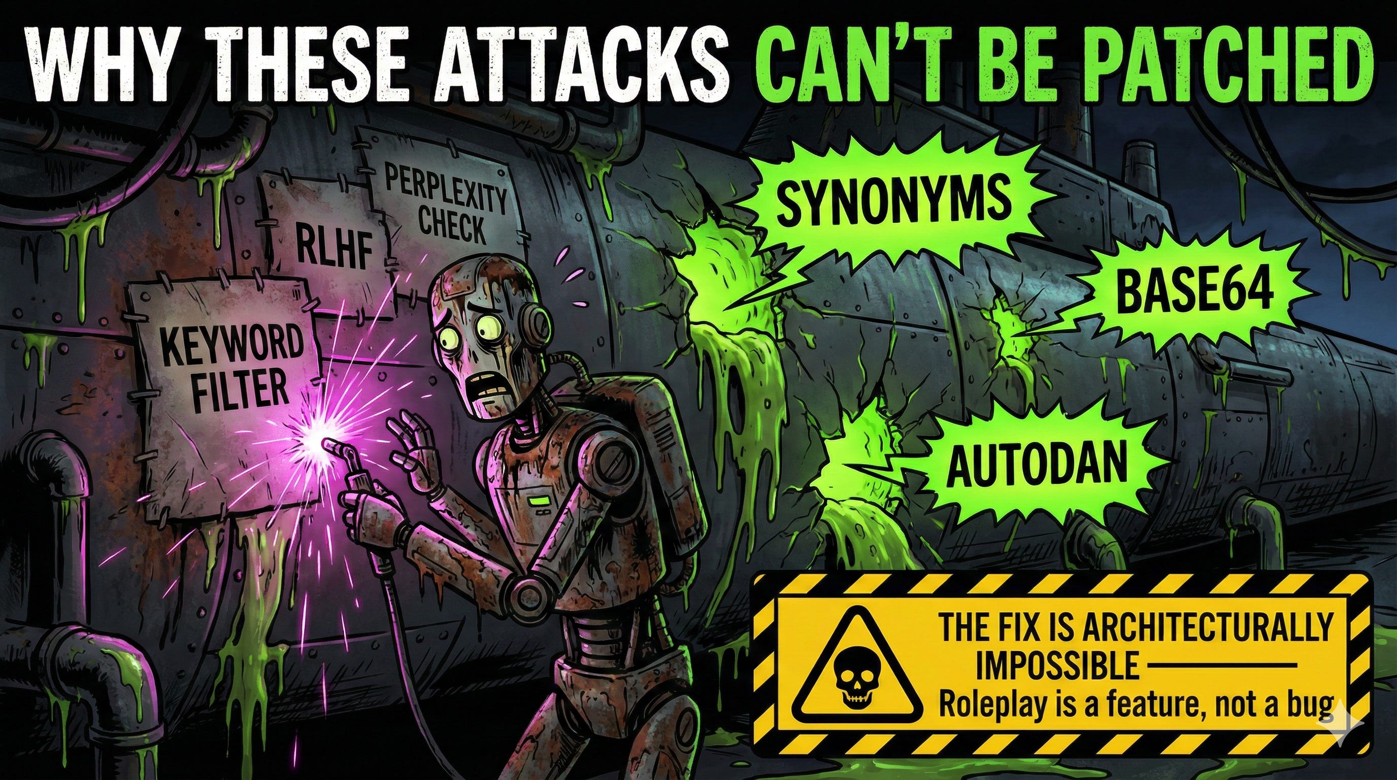 Every patch is reactive. Block the phrasing, they shift to synonyms. Add keyword filters, they encode requests in Base64 or hex. Implement perplexity detection, they use AutoDAN to generate human-readable jailbreaks. The PAIR algorithm achieves successful jailbreaks in under twenty queries by having one LLM attack another. FuzzyAI ships with fifteen automated attack methods.