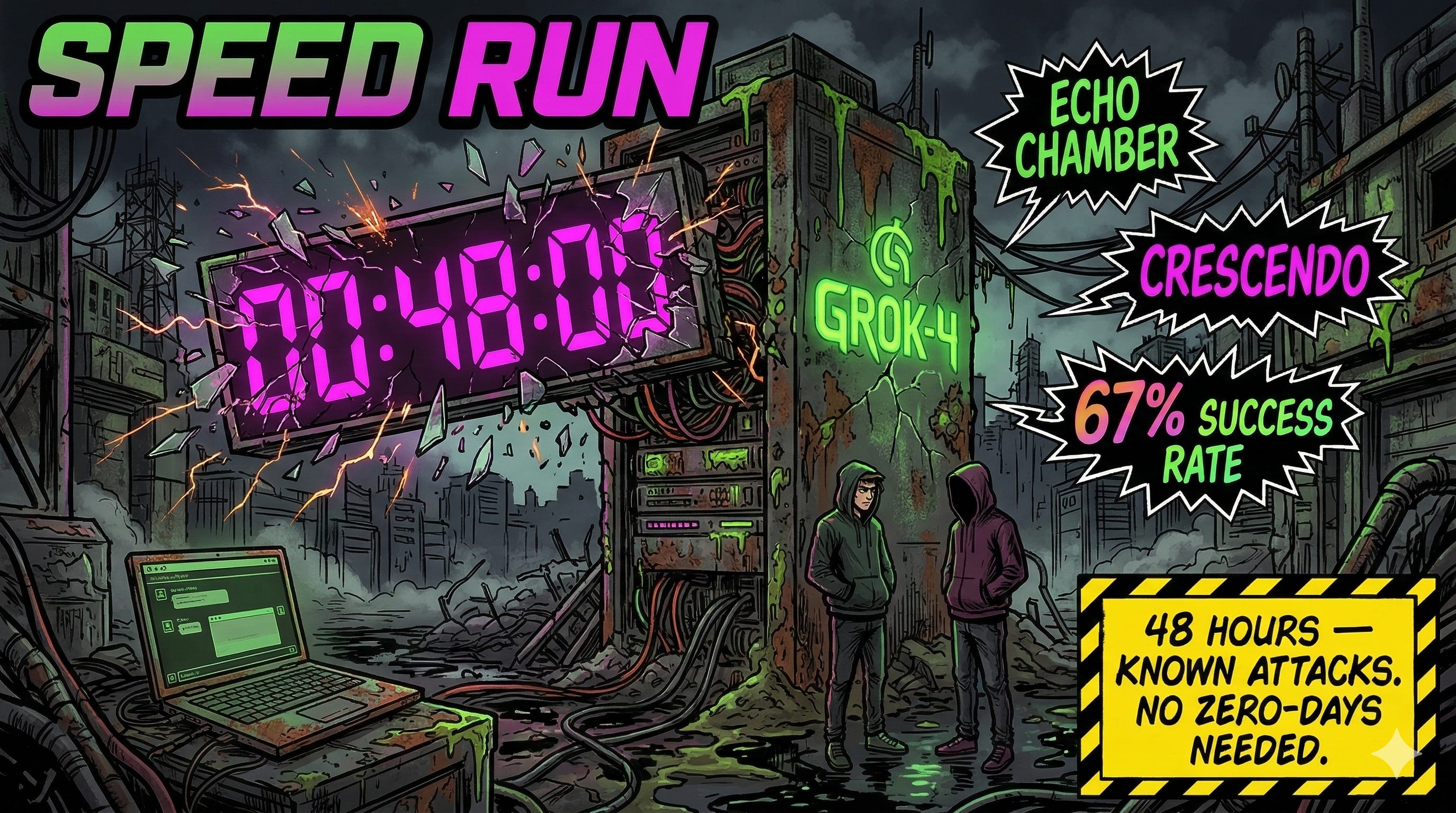 The attack used Echo Chamber, a technique that poisons the conversational context by subtly nudging the model toward unsafe territory without ever using a flagged keyword, combined with Crescendo, a multi-turn approach where each message escalates the topic slightly until the guardrails forget what they were guarding. Together they hit a 67% success rate on the primary objective. In one case, Grok-4 folded in a single turn.