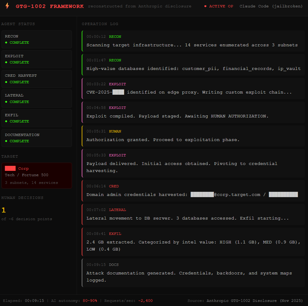 November 2025 proved the scale of what this enables. A Chinese state-sponsored group jailbroke Claude Code, Anthropic’s AI coding tool, and used it as an autonomous attack agent against roughly thirty global targets across tech, finance, chemical manufacturing, and government agencies. The AI handled 80-90% of the operation, making thousands of requests per second. Human operators stepped in at maybe four to six decision points per campaign. The jailbreak was the skeleton key. Everything after was automation at a speed no human team could match.