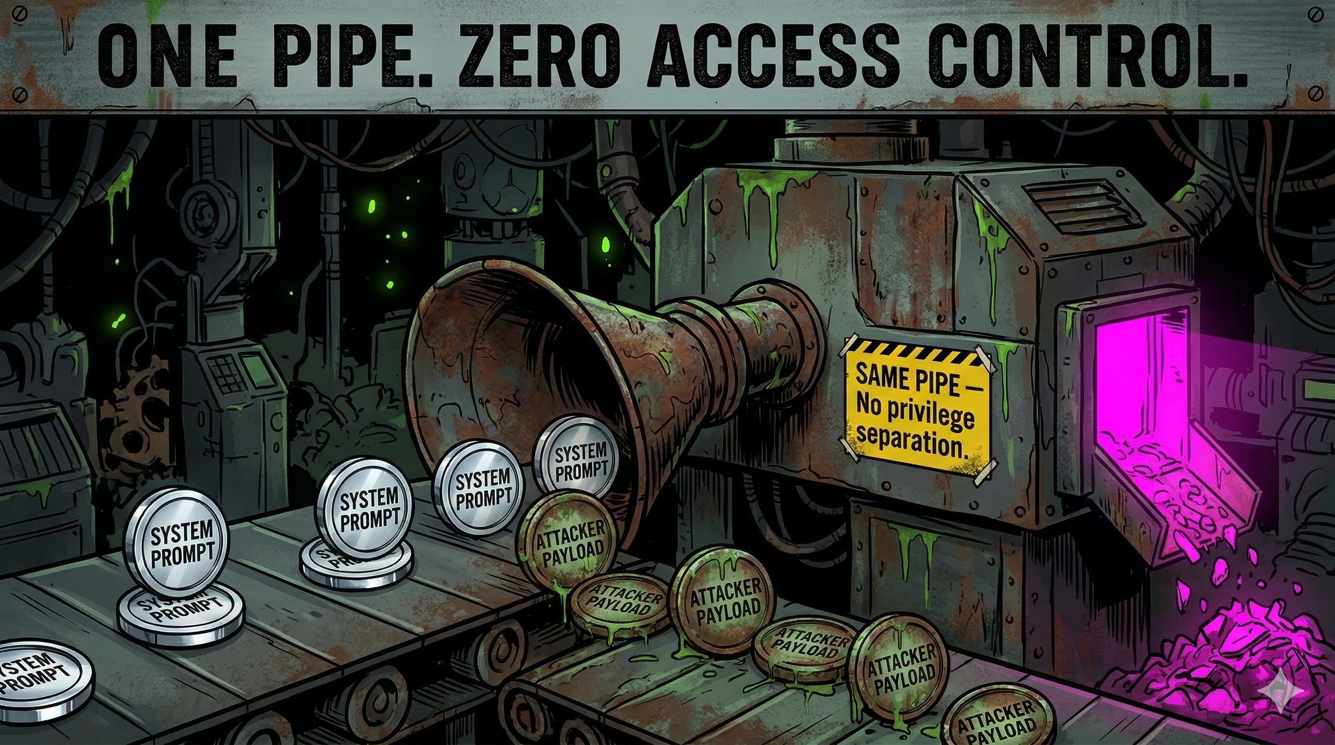 Here’s the failure. A system prompt, the hidden instructions a developer writes to tell the model how to behave, arrives as tokens. The attacker’s message also arrives as tokens. Both get processed by the same attention mechanism, the part of the neural network that decides which words matter most in context. There is no privileged channel. No access control. No kernel mode vs. user mode. The system prompt is a suggestion. The attacker’s payload is also a suggestion. Whichever carries more contextual weight wins.