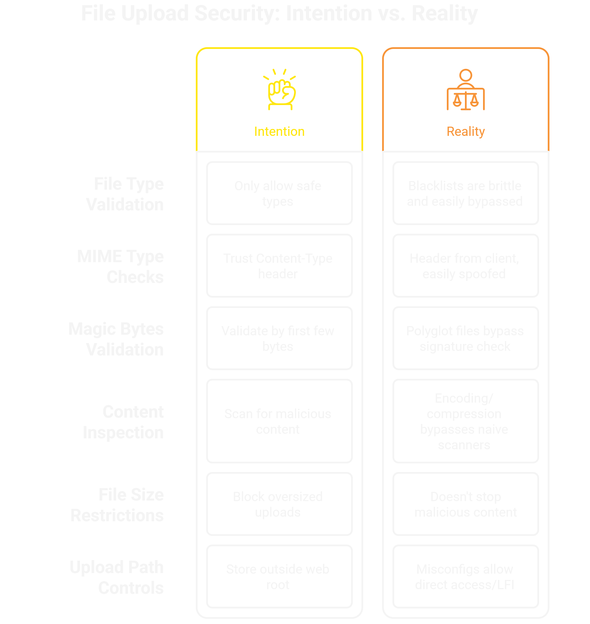 ).Reality: Polyglot files beat this. Prepend JPEG bytes to a PHP payload, and it passes the signature check while still executing server-side.