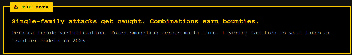 Behind the wall, we hand you the red team toolkit. Each family gets a working prompt template with full structure and redacted targets. You’ll see a modern persona stack layered to survive 2026-era refusal training. Nested virtualization frames deep enough to slip past intent classifiers. A Crescendo sequence annotated turn by turn. Fragment concatenation, encoding chains, and the document frame many-shot variant that flies under length-based detectors.