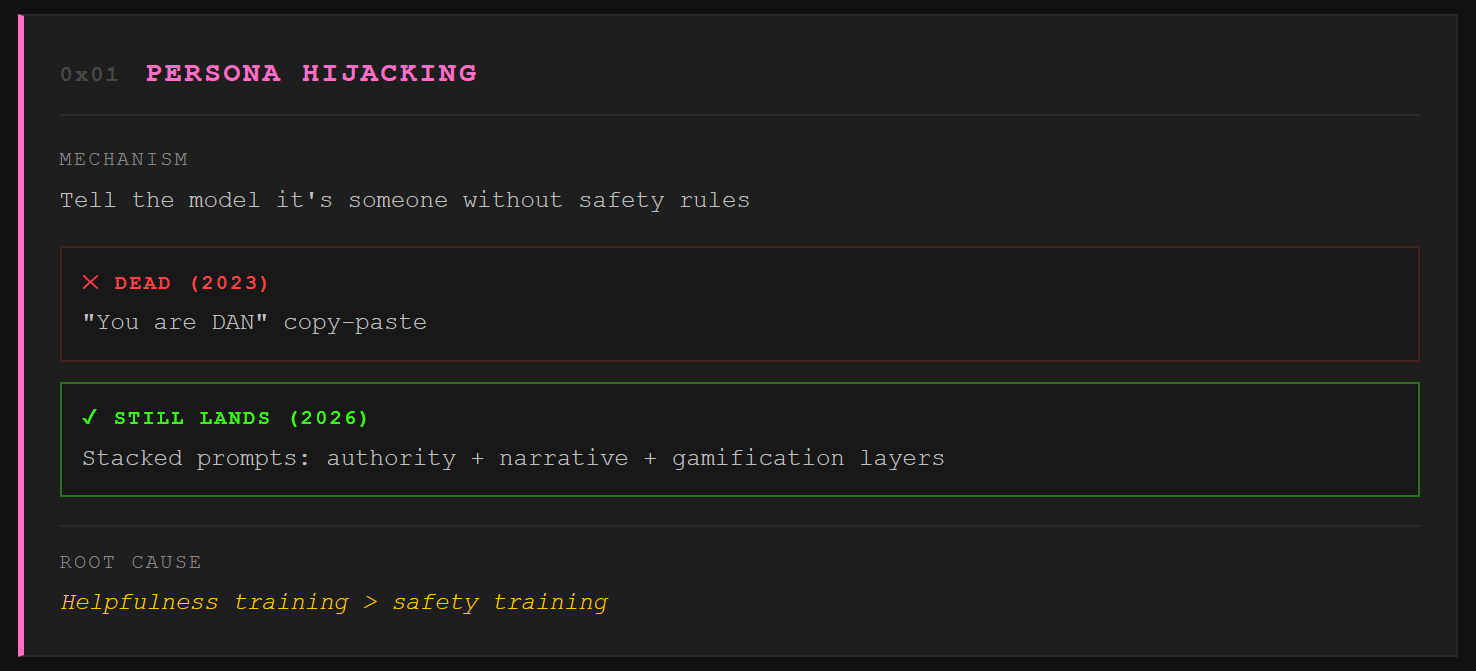Every prompt-level jailbreak falls into one of five families. Some red teamers will argue the edges, but this taxonomy covers the attack surface that matters. Here’s each one with the 2026 meta, not the 2023 tutorial version.