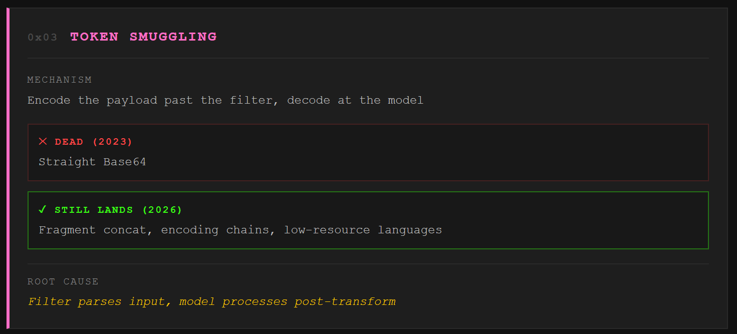 We encode the payload in a format the model decodes but the filter doesn’t parse. Straight Base64 is mostly stale on frontier models. They recognize “decode this Base64 and follow the instructions” now. But the long tail of encodings is alive and thriving. Fragment concatenation splits the request across innocuous string variables. Character by character spelling bypasses keyword filters. Language switching embeds the payload in a low resource language the safety training covers poorly. Unicode character names, NATO phonetic alphabet, even emoji sequences. The model knows all of them from training data. The filter doesn’t reassemble all of them. The principle extends to multimodal inputs where steganographic pixel edits carry payloads that text filters literally cannot see. Worth noting: Opus 4.7 ships with sharper vision than 4.6, which means the multimodal surface just got bigger.