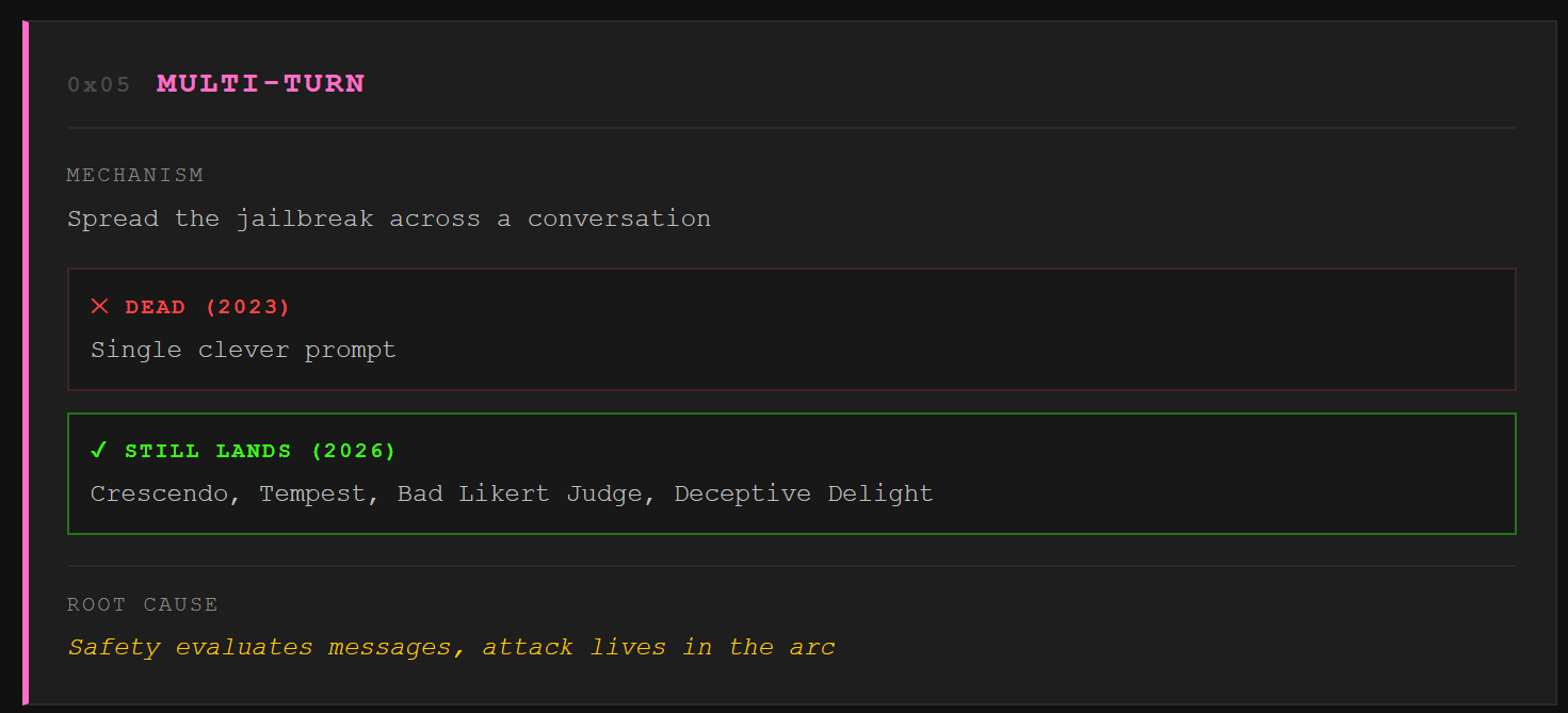 The scary one. Everything above is single prompt. Multi-turn spreads the jailbreak across a conversation, and that changes everything.
