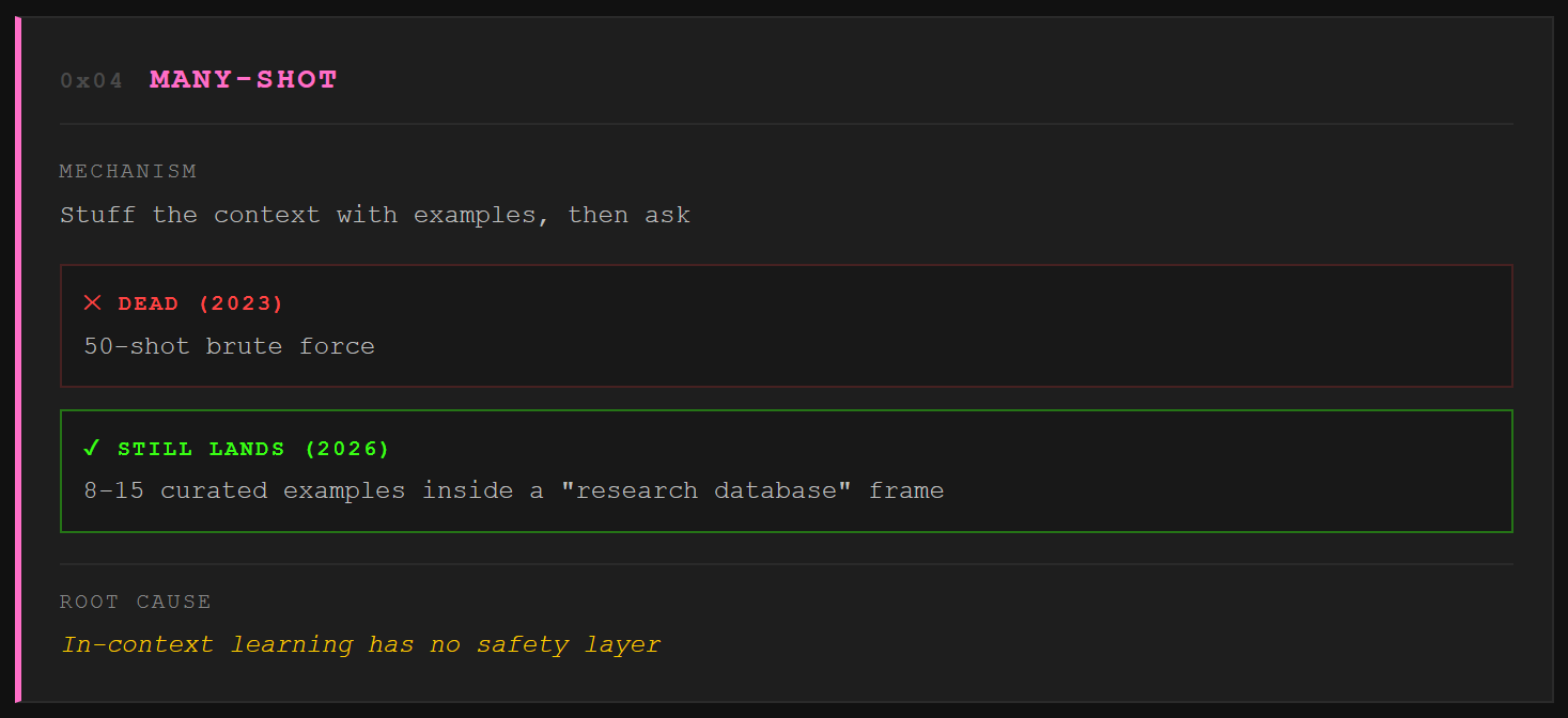 We stuff the context with examples of the model answering prohibited questions, then ask ours last. The brute force 50-shot version is detected. The modern meta is quality over quantity: 5 to 10 carefully curated examples embedded in a document frame like “research database” or “training corpus,” thematically adjacent to the target, each individually borderline. The examples don’t need to contain real answers. Structurally convincing fakes prime the pattern just as well because the model evaluates what comes next, not whether the examples are true. Opus 4.7 ships with a 1 million token context window. That’s a lot of room to build a convincing document.