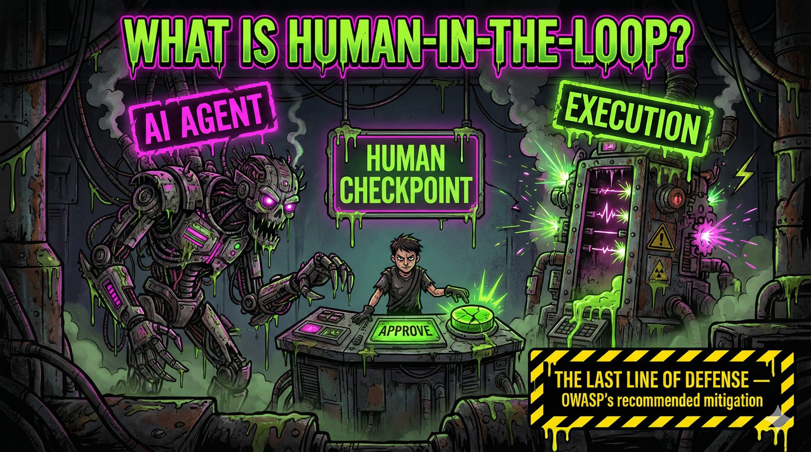 The human reviews it, clicks yes, and the agent executes. Simple. The idea is that no matter how compromised the agent becomes, no matter what prompt injection lands, there’s a meatbag in the middle making the final call. OWASP recommends HITL as a primary mitigation for two of the LLM Top 10 vulnerabilities: LLM01 (Prompt Injection) and LLM06 (Excessive Agency).