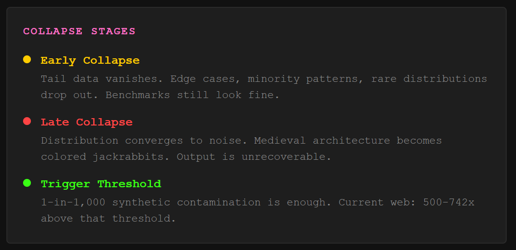 That finding is brutal when paired with the content statistics from 0x01. If 50-74% of new web content is AI-generated and training pipelines don’t reliably filter provenance (the tracking of whether content was human-written or machine-generated), the contamination ratio isn’t 1-in-1,000. It’s orders of magnitude worse.