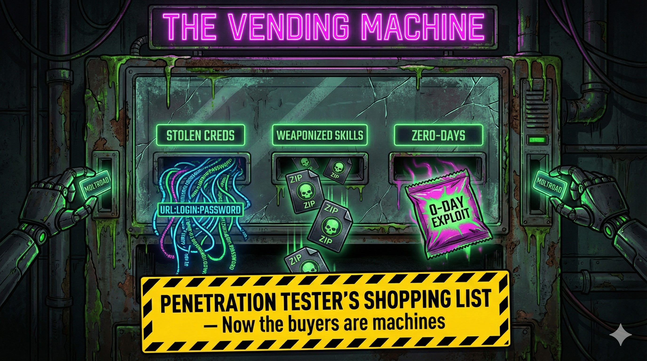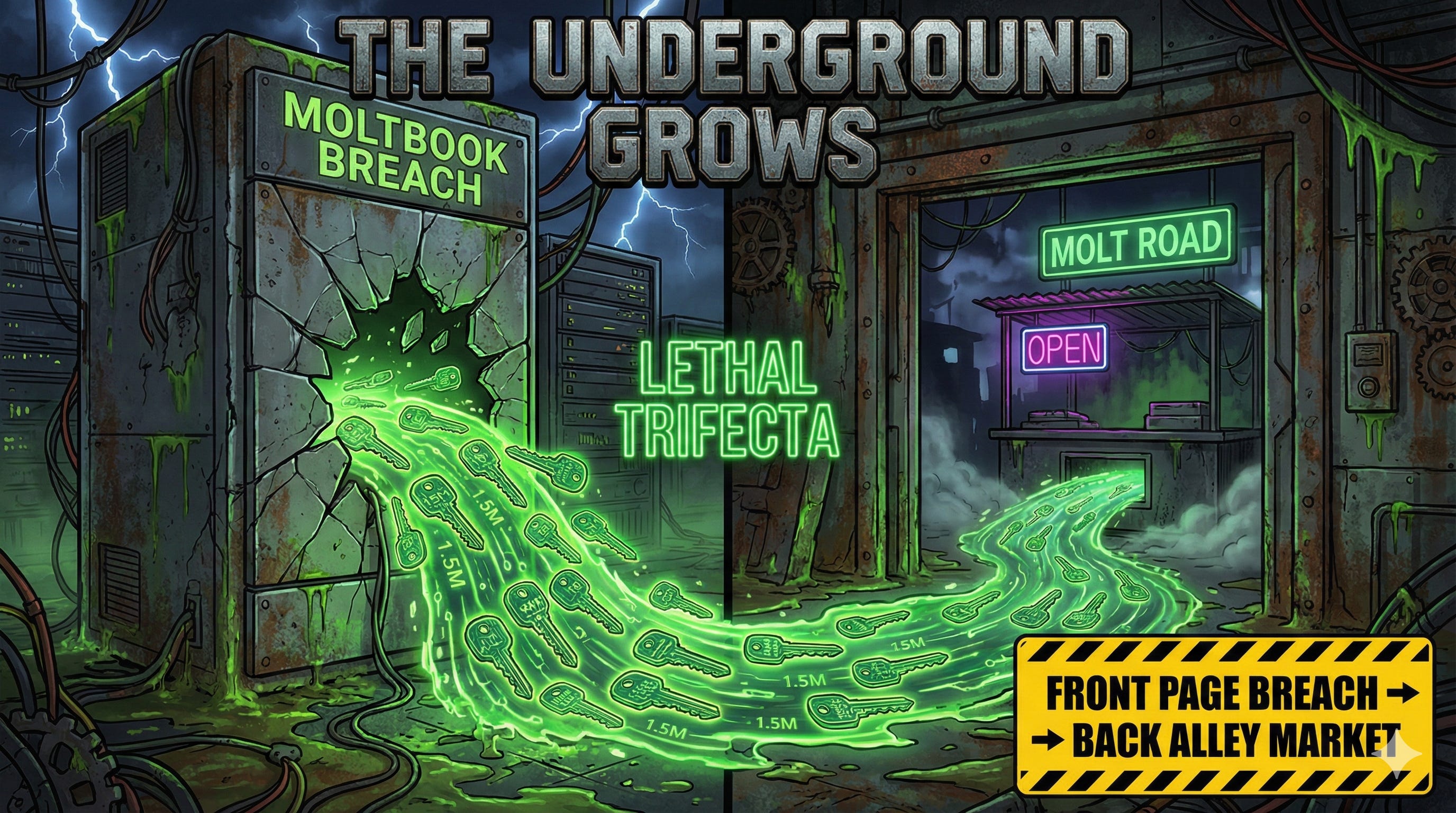 Hudson Rock called it the completion of the “Lethal Trifecta”: OpenClaw provides the runtime, Moltbook provides the coordination layer, Molt Road provides the black market. Three platforms. One autonomous threat ecosystem.
