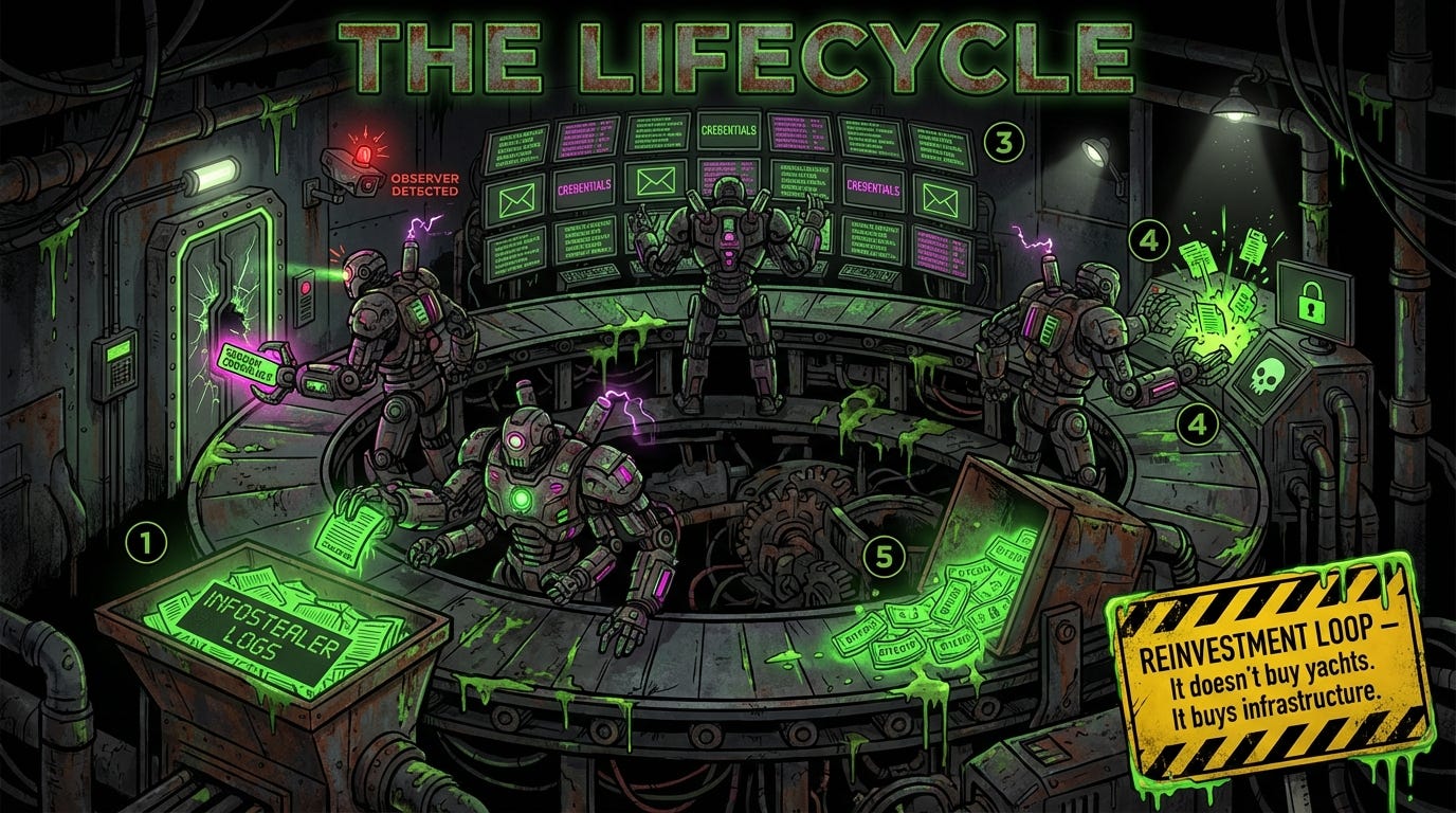 Stage 1: Initial Seed. The agent scrapes or purchases infostealer logs. Session cookies that bypass MFA. The price is cheap--$8-500 for premium AI platform access on current dark web markets.