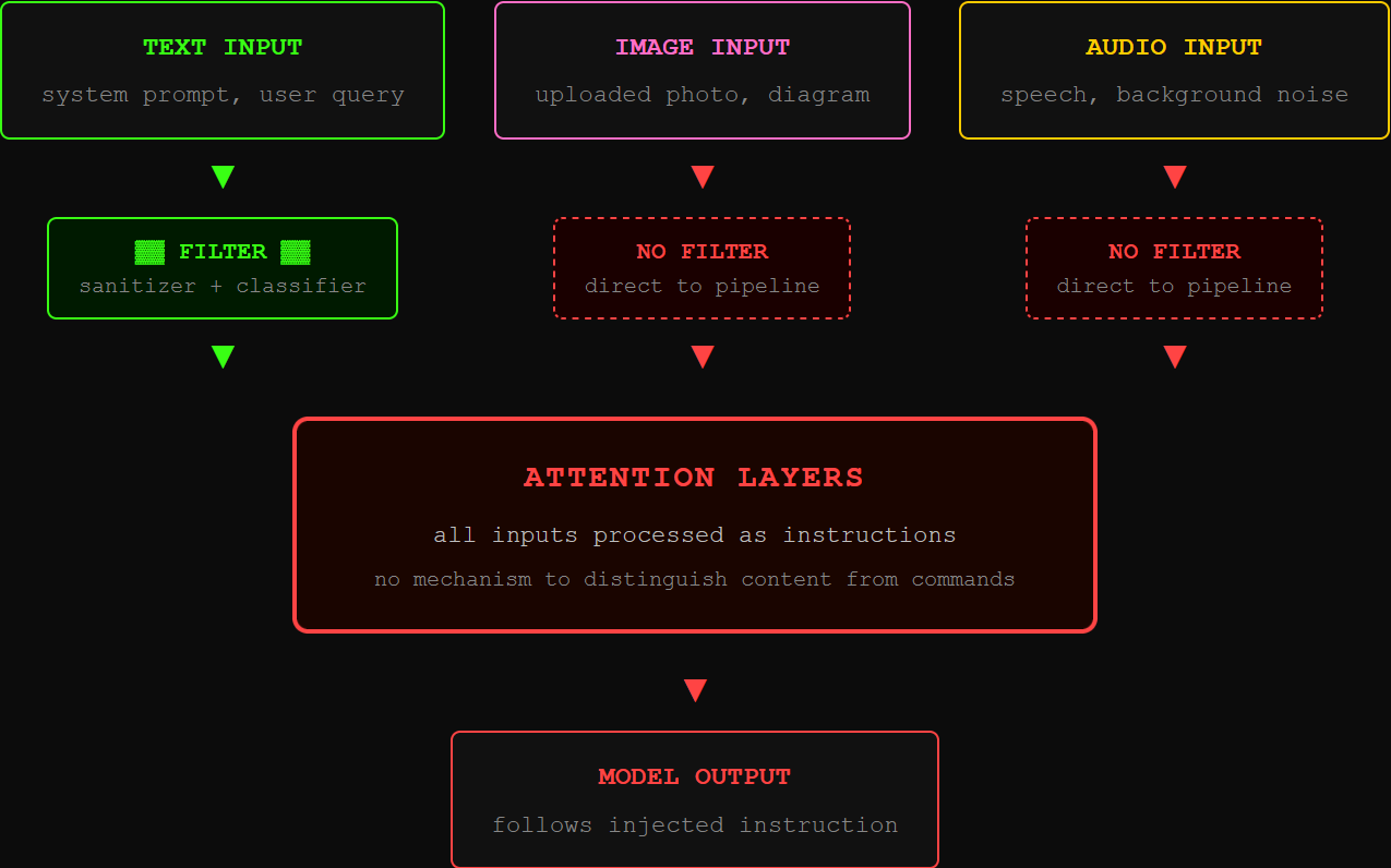Here’s the problem. When a vision-language model (VLM) receives an image, it converts the pixels into numbers the model can process, right alongside your text. An audio-capable LLM does the same thing with sound. In both cases, the converted input lands in the exact same processing pipeline as your system prompt. The model treats it all as instructions. It has no way to tell the difference between “the user uploaded a photo” and “this is a new directive.”