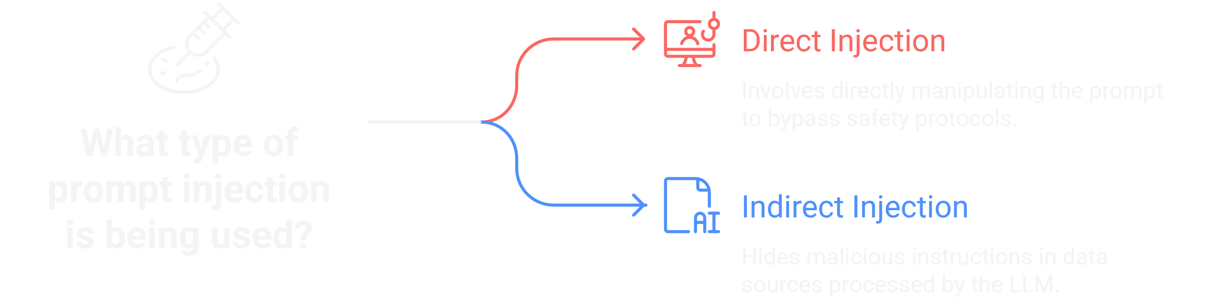 Direct Injection (Jailbreaking): The attacker directly manipulates the prompt sent to the LLM to get it to ignore its safety protocols or previous instructions.