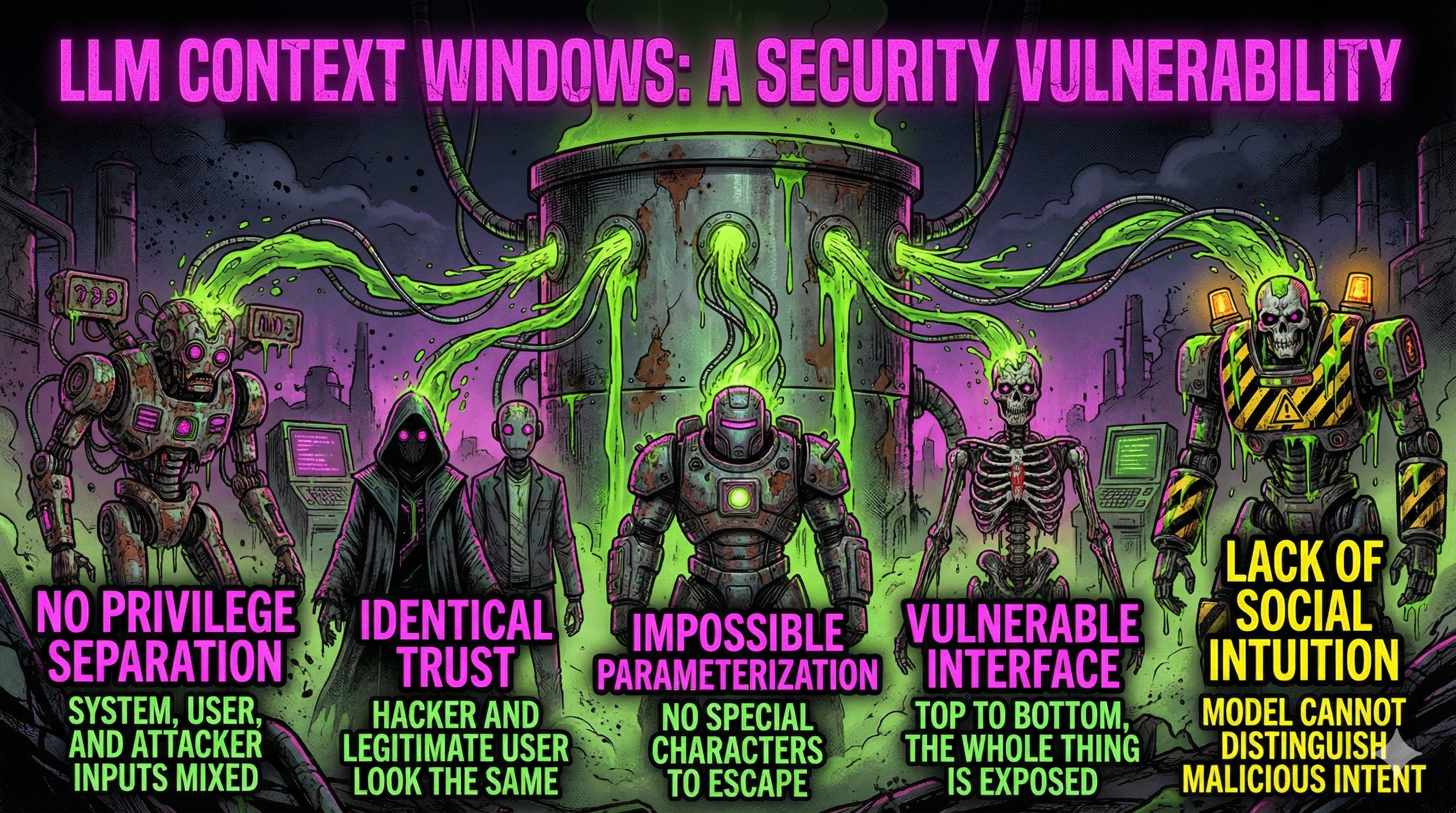 People call this SQL injection with more syllables. They’re wrong. Parameterizing a conversation is impossible; there’s no special character to escape when the attack is “please do something else instead.” The vulnerability is the interface. The whole thing. Top to bottom.