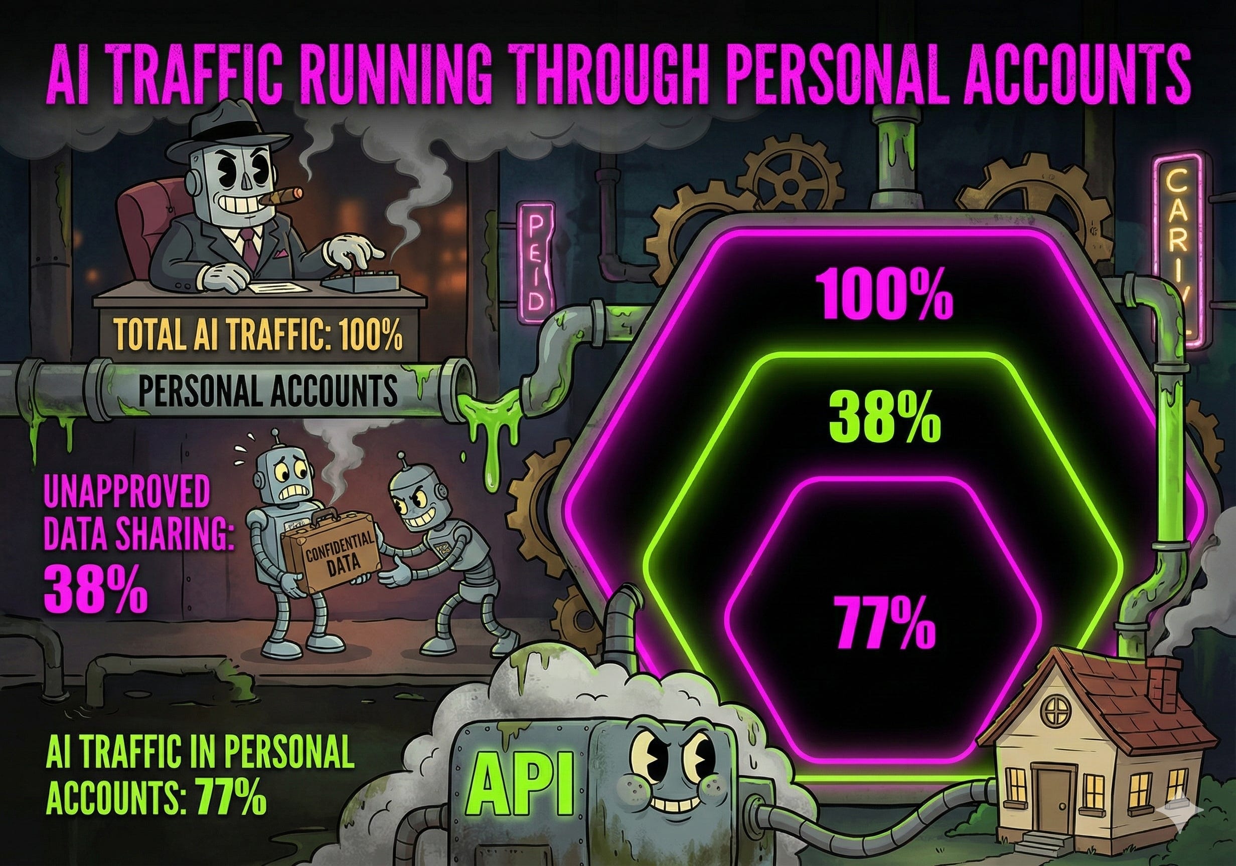 You know what’s NOT on their spreadsheet? The seventy-seven percent of AI traffic running through personal accounts. Personal devices. Personal browser sessions your security stack can’t see because it’s busy monitoring the APPROVED channels where NOTHING IS HAPPENING.