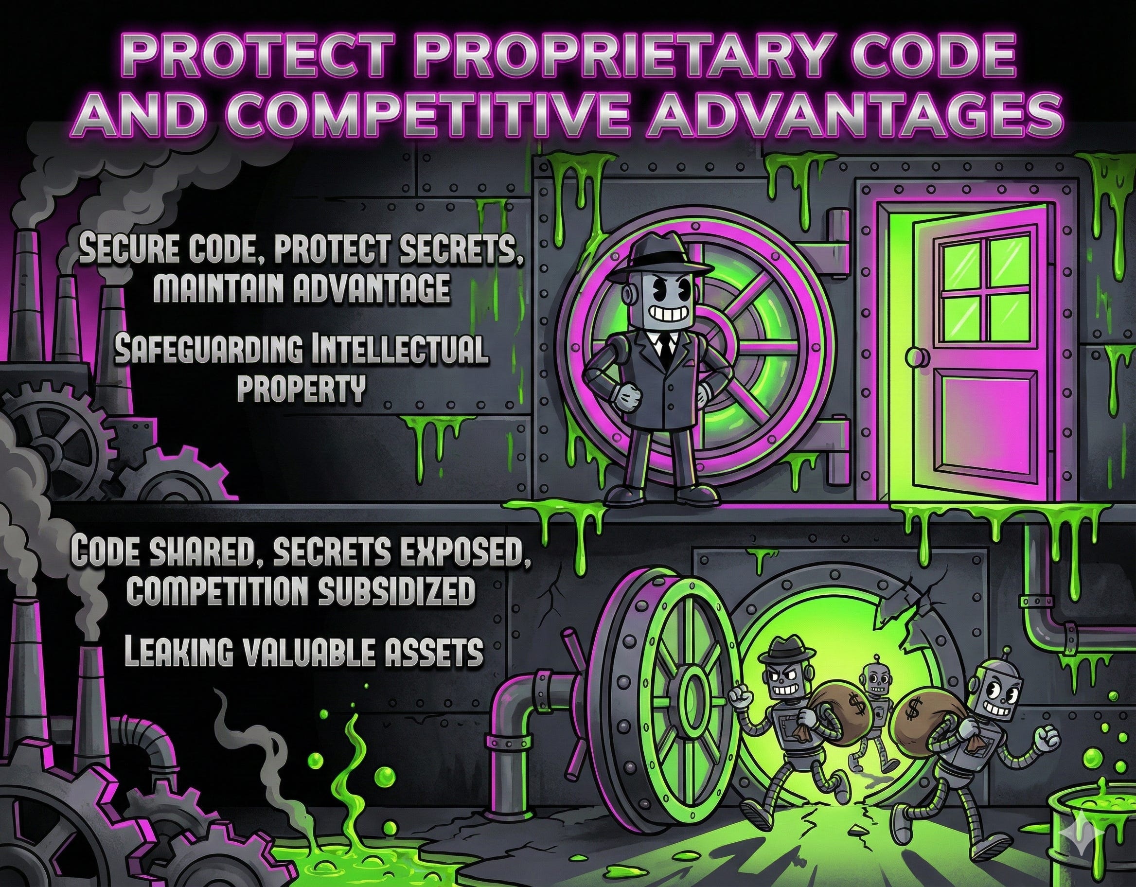 Those AI models train on SOMETHING. When your engineer pastes code into the chatbot to debug it, that code doesn’t evaporate. It lands on third-party servers. It enters training pipelines. It becomes part of the model that YOUR COMPETITORS ALSO USE.
