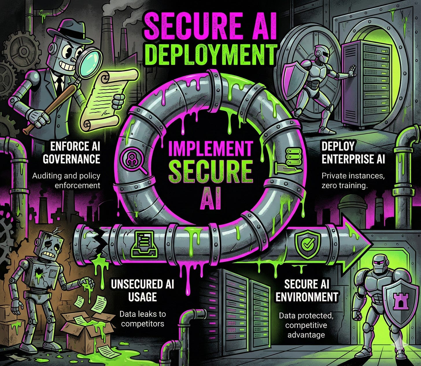 Option one: Deploy sanctioned enterprise AI with actual guardrails. Private instances. Zero training on inputs. Yes it costs money. Less money than the stupidity tax. Infinitely less than watching your competitors ship products built on your IP.