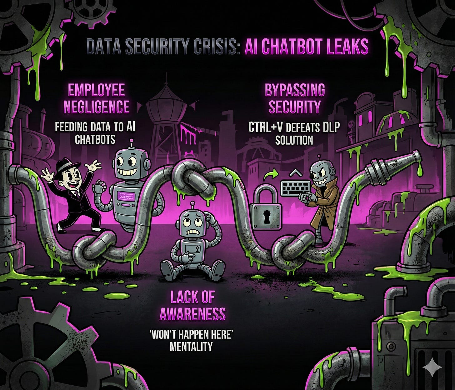 I had to look into our data security situation. Turns out we’ve been running a charity. FULL EXFILTRATION. One in five breaches now trace back to employees feeding proprietary information to AI chatbots like they’re tipping a valet. “Here’s our source code, here’s our product roadmap, here’s everything that gives us a competitive advantage. Keep the change!”