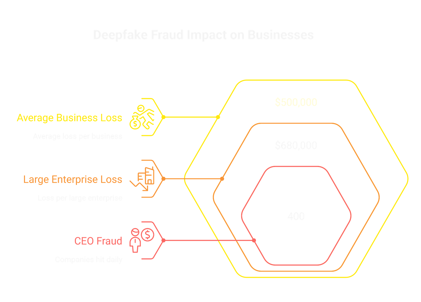 Businesses lost five hundred thousand average to deepfake fraud in 2024. Large enterprises, six hundred eighty thousand per incident. CEO fraud hits four hundred companies daily.