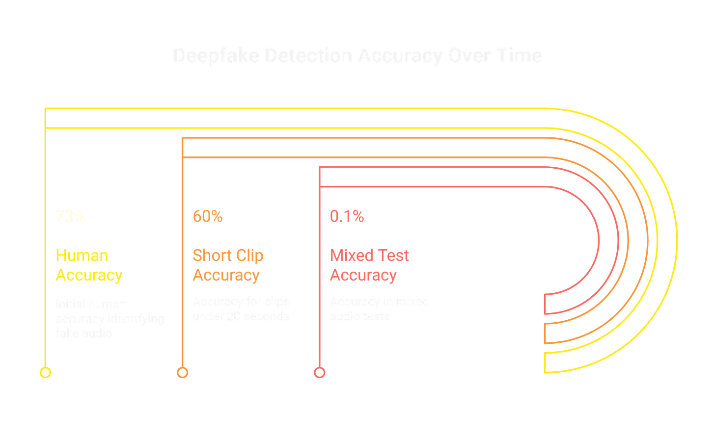 Humans are at seventy three percent accuracy identifying fake audio. For clips under twenty seconds, sixty percent. Coin flip territory. In mixed tests, only point one percent caught all the fakes.