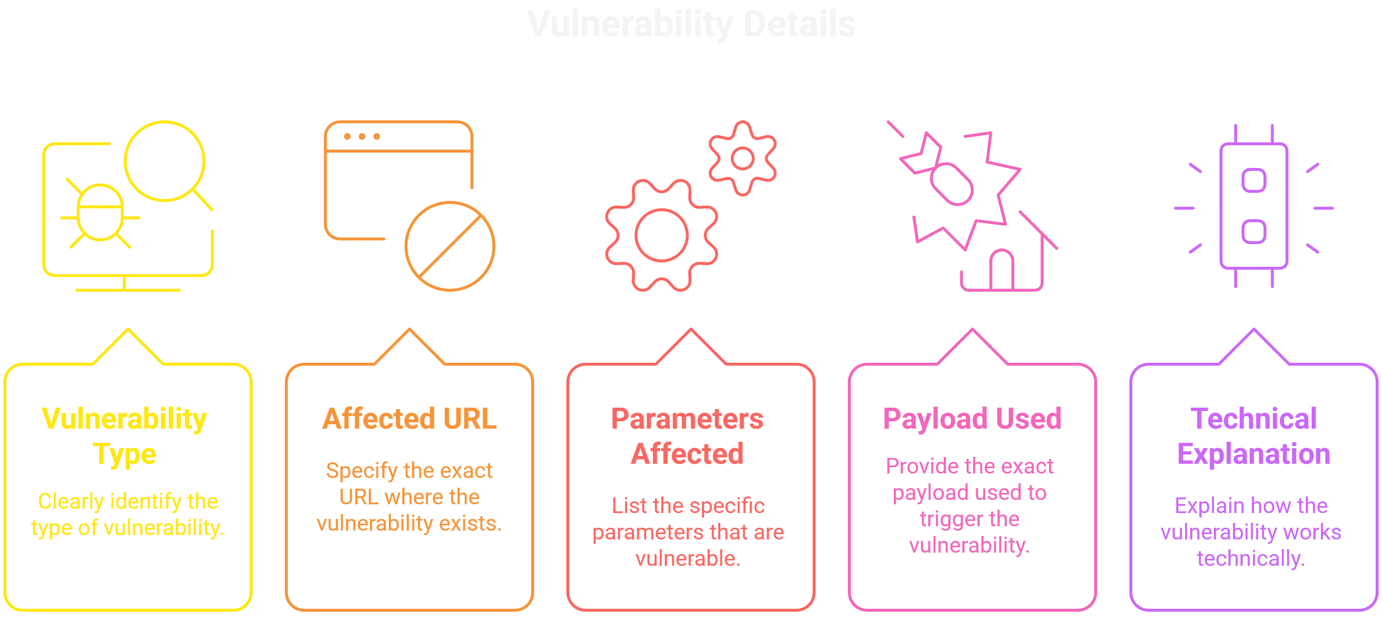 Title: A concise and descriptive title that accurately reflects the vulnerability. For example, "Reflected XSS on User Profile Page" or "SQL Injection in Product Search Functionality."